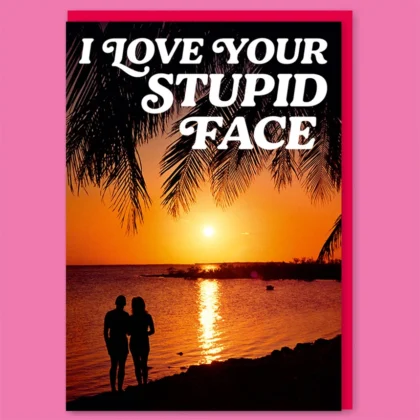 A Valentines card featuring a romantic sunset beach scene with a silhouetted couple. White slanted text at the top reads I love your stupid face.