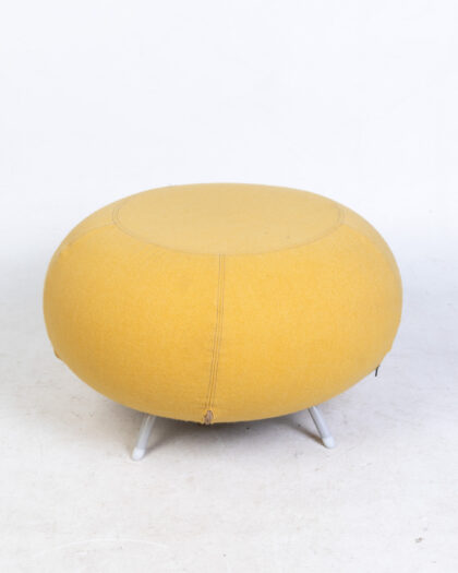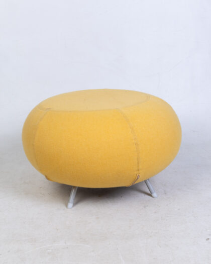 Inject a vibrant pop of color and retro charm into your living space with this delightful vintage 80s footstool. Upholstered in a cheerful yellow fabric, its distinctive round shape is complemented by sleek grey metal legs, offering a modern touch. The design features an intriguing circular stitch pattern on the top and near the base, adding unique visual interest. Perfectly sized to provide a comfortable spot to rest your feet after a long day, this versatile piece also functions wonderfully as extra seating or a stylish accent table. Its compact design makes it an ideal addition to a lounge, snug, or bedroom, enhancing any contemporary or vintage-inspired interior.