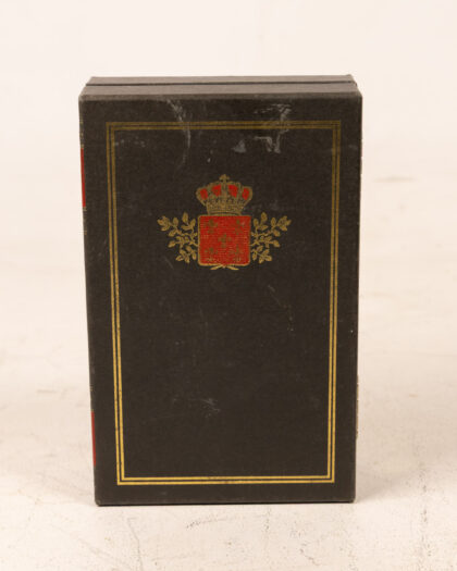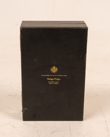 This is a vintage Design Philipp trinket box disguised as books, labeled Volume I and Volume II. The box features a gold-colored crown and coat of arms design on the front. On the back it says By Appointment To The Royal Swedish Court Design Philipp Skandetui Malmö Made in Sweden.