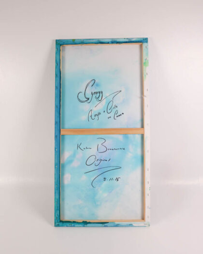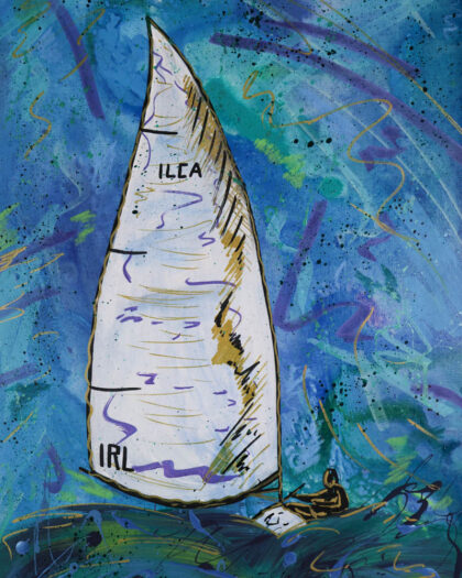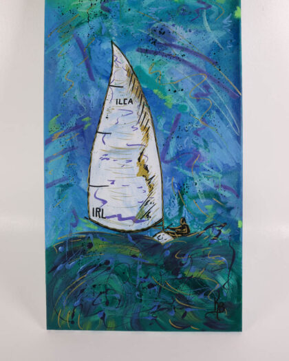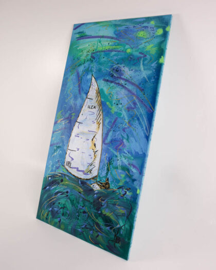 This is an original painting by Kate Broderick, depicting a sailing yacht at sea. The painting is done on canvas using acrylic and oil paints. The painting features bright blues and greens with some splashes of purple. The canvas measures approximately 80cm in height and 40cm in width. The painting is brand new and ready to hang. This lovely piece of art would look good in any room of the house.