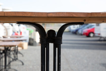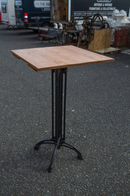 A tall bar or restaurant table with a heavy cast iron base and pine top.
