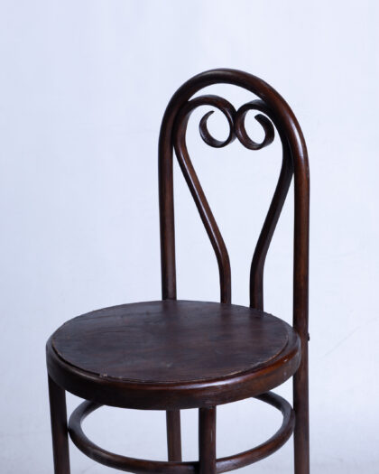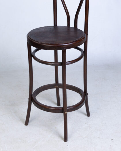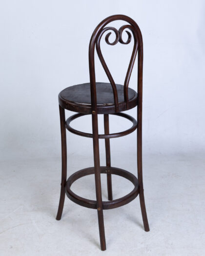 Tall Bentwood Bar Stool with Decorative Back. Dark wood tone, round seat and circular support.