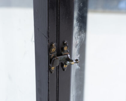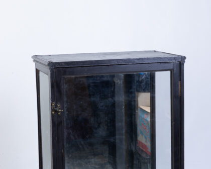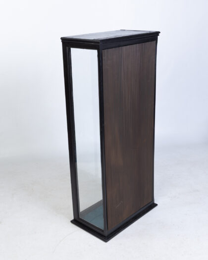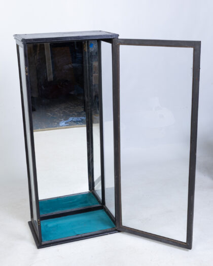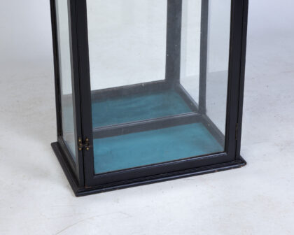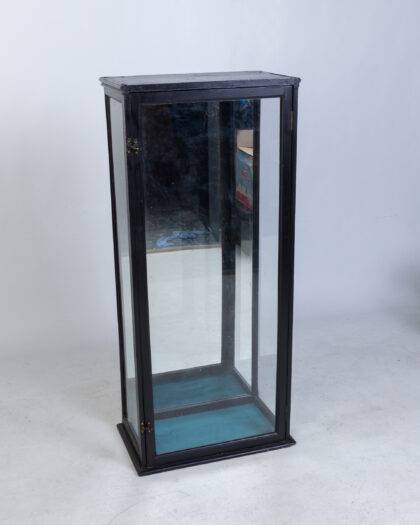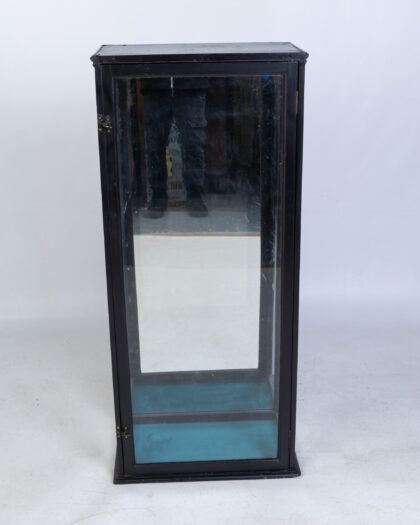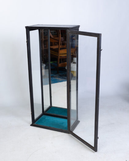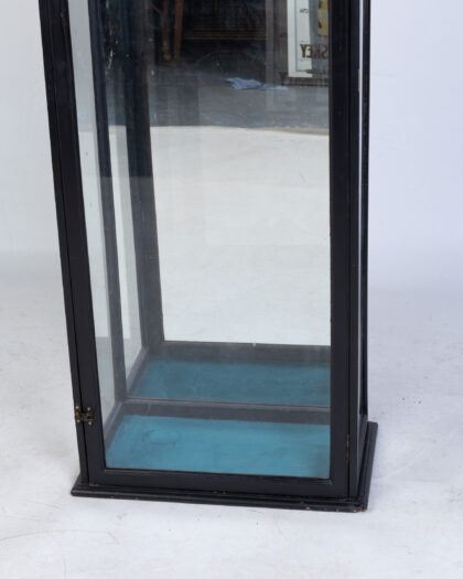 Tall display cabinet with black painted frame, glass panels, brass latch, and blue fabric base. Perfect for showcasing collectibles.