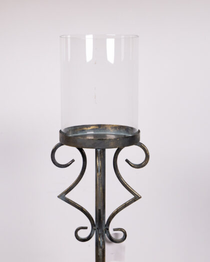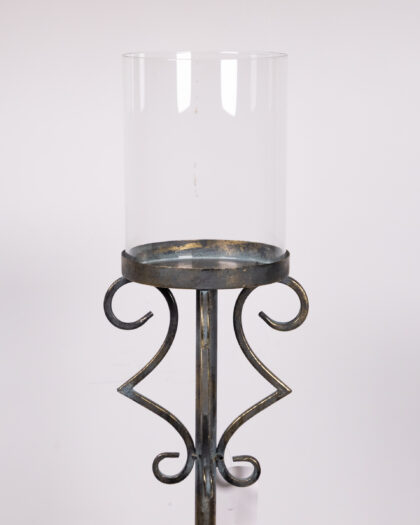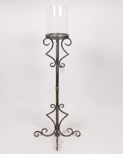 Tall candle holder with an ornate base and clear glass hurricane shade. Perfect for any home.