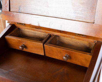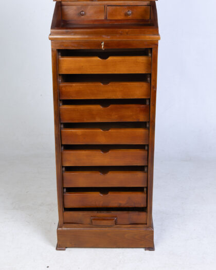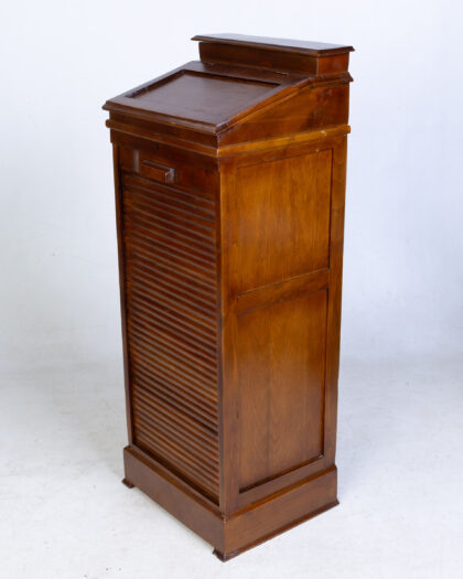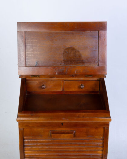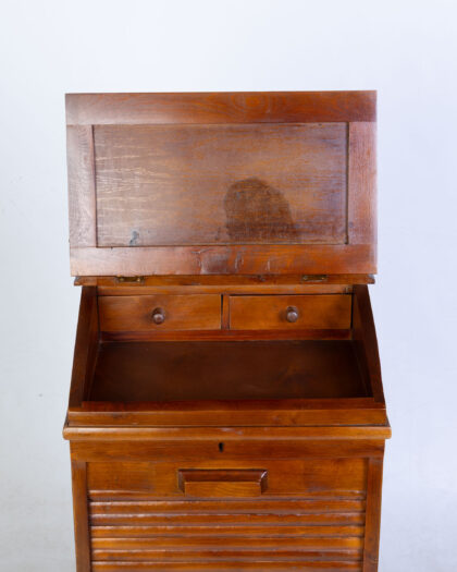 This is a tall cabinet constructed from oak. It features a tambour front, which slides open to reveal the cabinet's interior. Above the tambour section, there is a small hutch or desk area with two small drawers, perfect for storing small items. The cabinet stands on a solid base. The overall condition is good, with the patina of age adding to its charm. The tambour mechanism is functional. There are also internal shelving opportunities, making it a functional and attractive piece of furniture.