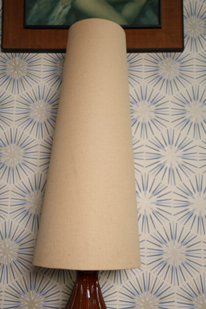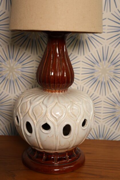 A West German ceramic vase which has been turned into a lamp with a tall shade.