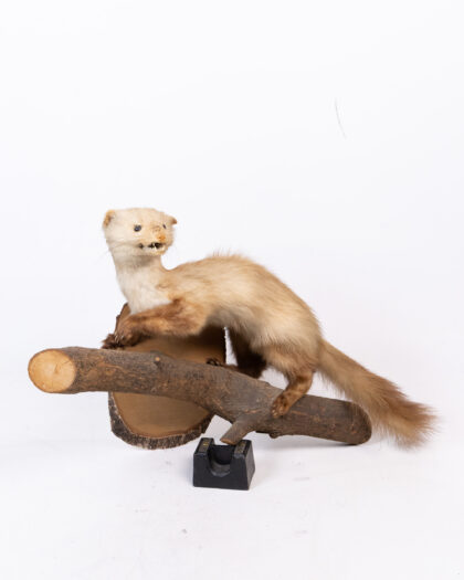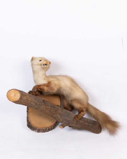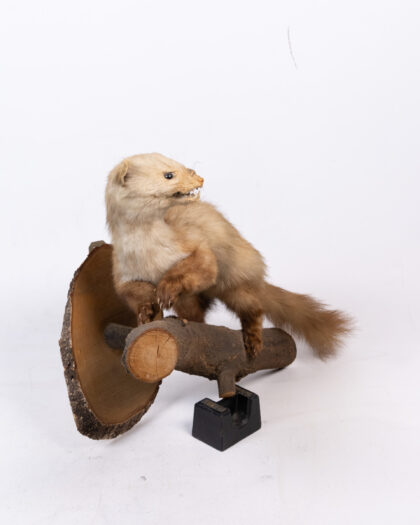 This is a taxidermy beech marten (martes foina) mounted on a wooden display piece. The marten is posed upright on a branch, appearing alert. Its fur is a mix of brown and cream. The mount is a section of a tree branch attached to a wooden base. This unique item could make an interesting display piece.