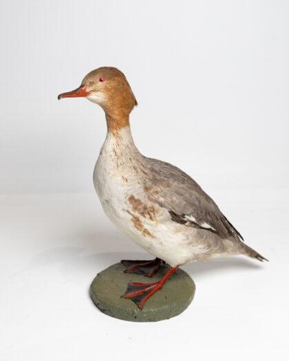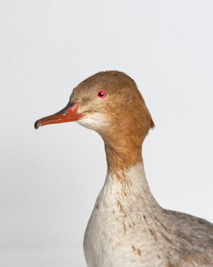 This taxidermy piece features a beautifully preserved Common Merganser with stunning detail and lifelike appearance. Mounted on a sturdy base, it showcases the bird's distinctive features and colours. Ideal for display in a home, office, or educational setting. Condition is excellent, with no visible damage.