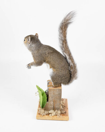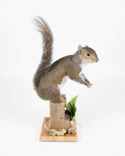 This is a mounted grey squirrel, presented on a wooden block base. The squirrel is posed in a lifelike standing position. The fur is soft and grey, fading to white underneath. The wooden base is surrounded with faux moss, leaves, and small white flowers. Overall, the piece is in good condition and would display well in a study, library, or living room.