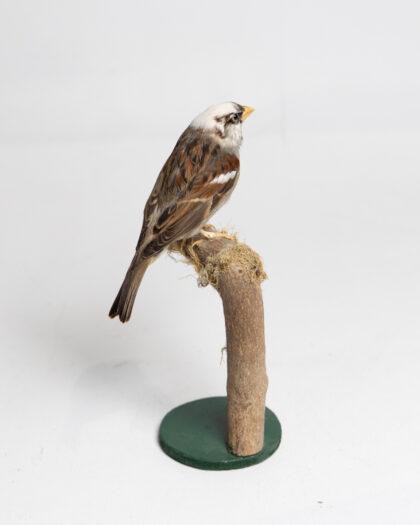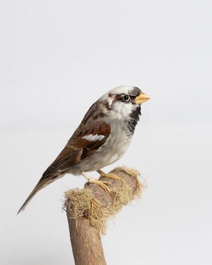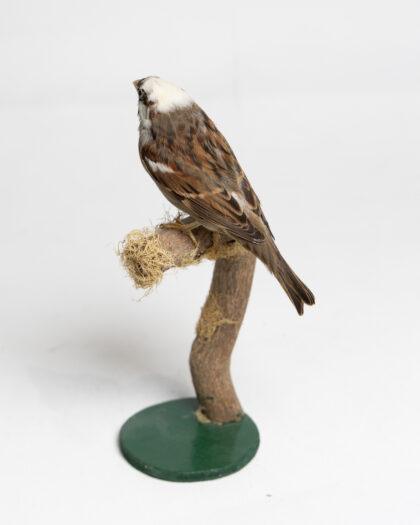 This exquisitely crafted taxidermy house sparrow captures the intricate details and vibrant colours of this bird. Mounted on a natural wooden stand, it stands as a perfect piece for adding a touch of nature to any room. The bird is in excellent condition, showcasing realistic features and fine craftsmanship.