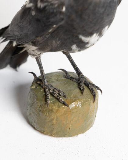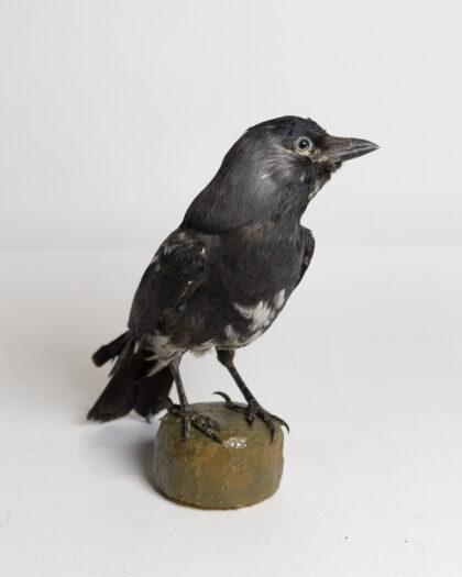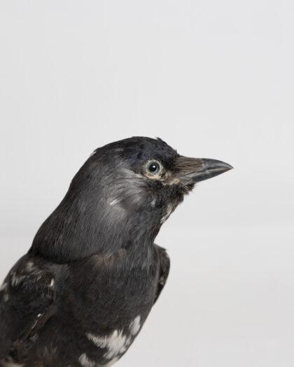 This taxidermy jackdaw is expertly preserved, showcasing its natural black and white feather pattern, the white feathers are an anomaly caused by a genetic pigment disorder called leucism. Mounted on a sturdy base, it is ideal for collectors of natural history or as a unique decorative piece. The bird is in excellent condition, with realistic features and detailed craftsmanship.