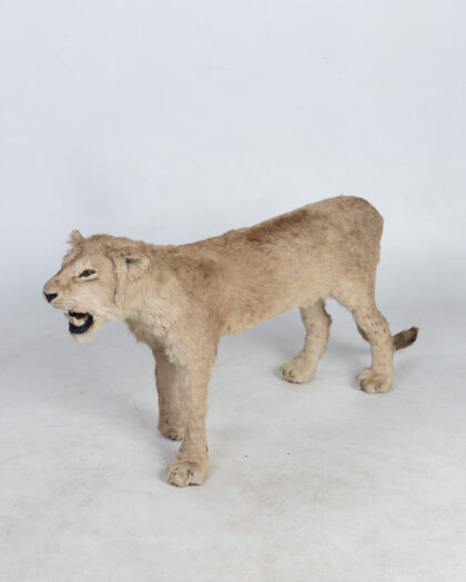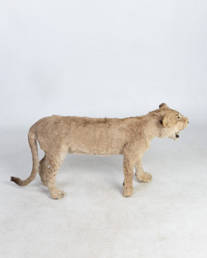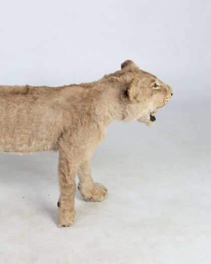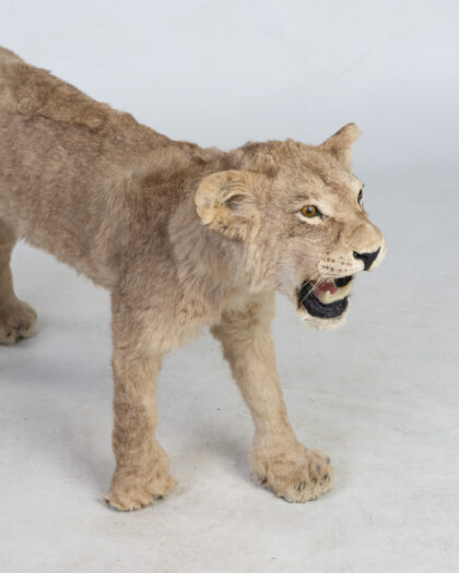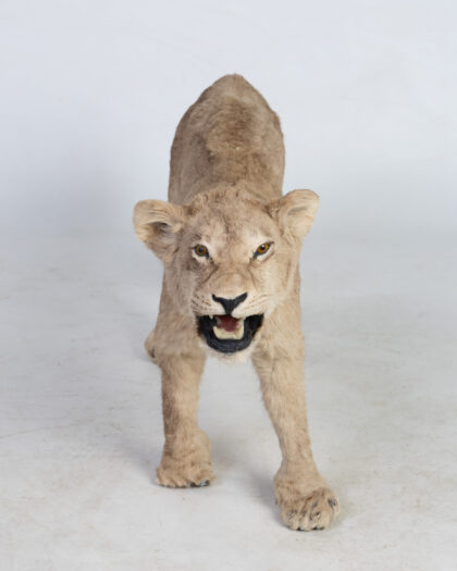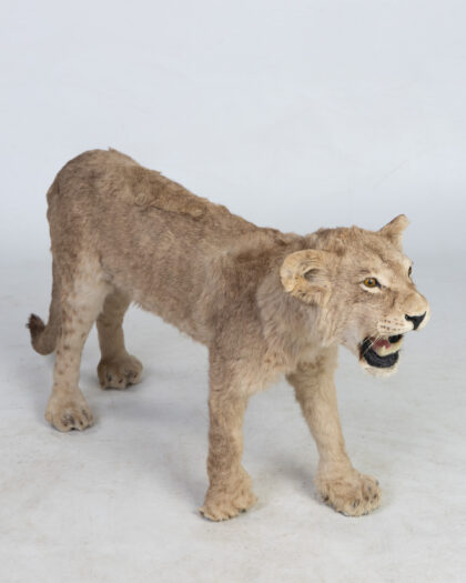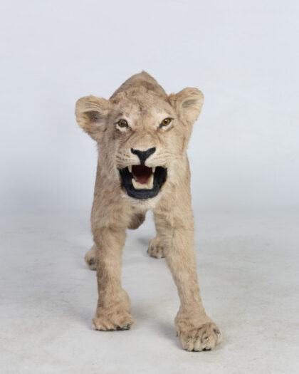 Taxidermy Lion Cub. Realistic walking pose, light brown fur. A unique, mounted piece for adding a bold and natural touch to any decor.