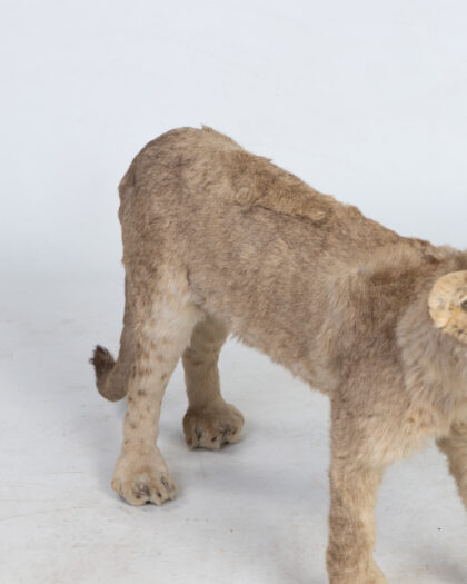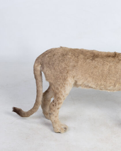 This is a striking taxidermy mount of a lion cub (Panthera Leo), presented in a walking pose.