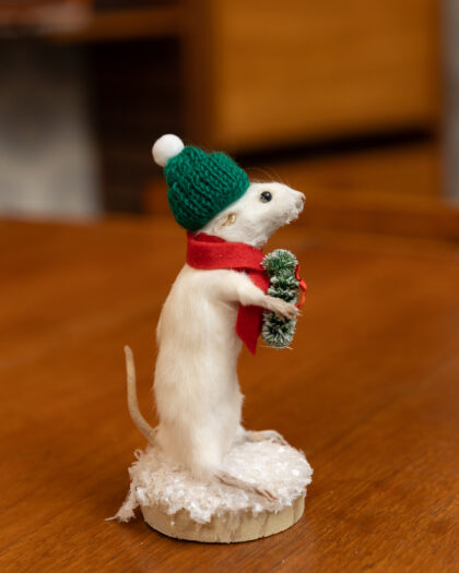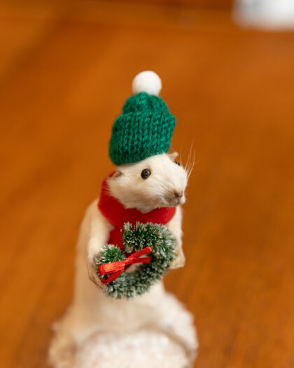 Delight in this charming taxidermy mouse, dressed for the festive season with a cosy hat and scarf, holding a miniature wreath. Perfect as a unique holiday decoration or conversation piece.