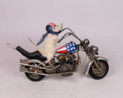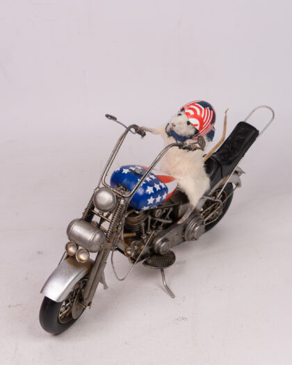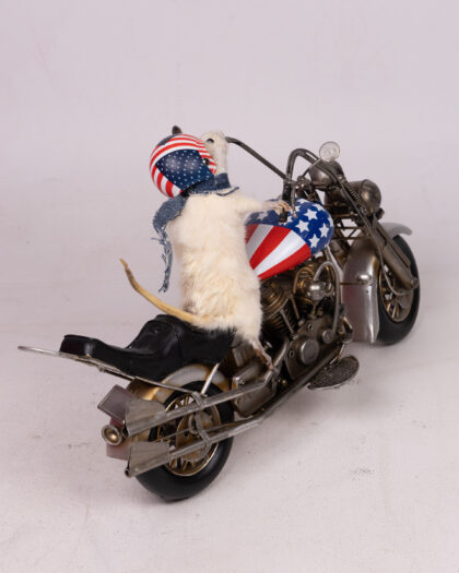 This is a taxidermy mouse mounted on a metal motorcycle model. The mouse is white and is wearing a helmet and scarf, both decorated with the American flag. The motorcycle is made of metal and is silver with a blue and red American flag design on the fuel tank. The motorcycle has a black seat. This item is a decorative piece, perfect for collectors of quirky items or taxidermy. It would make an eye-catching display in a home, office, or shop.