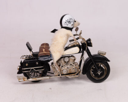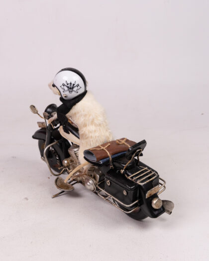 This is a small taxidermy mouse, posed sitting on a decorative motorcycle. The mouse is white, with a black cape, helmet and boots. The motorcycle is black with silver accents.