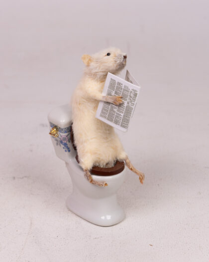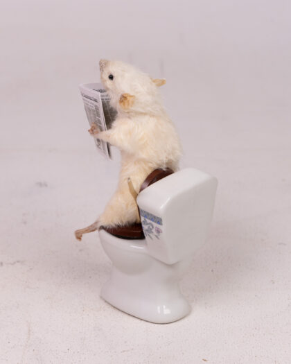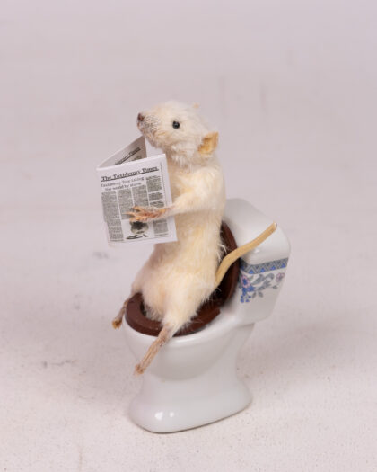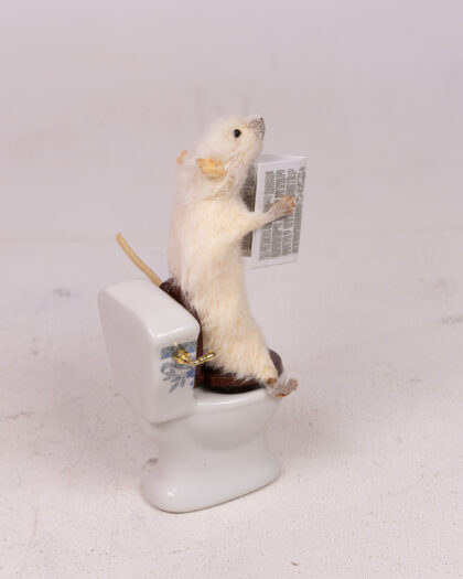 Taxidermy White Mouse Figurine on a miniature toilet reading 'The Taxidermy Times'. A humorous and unique collectible piece.