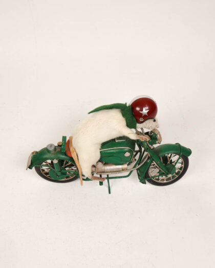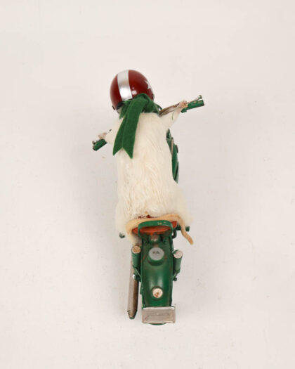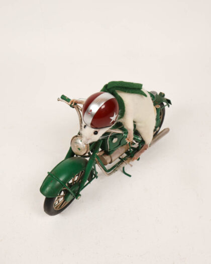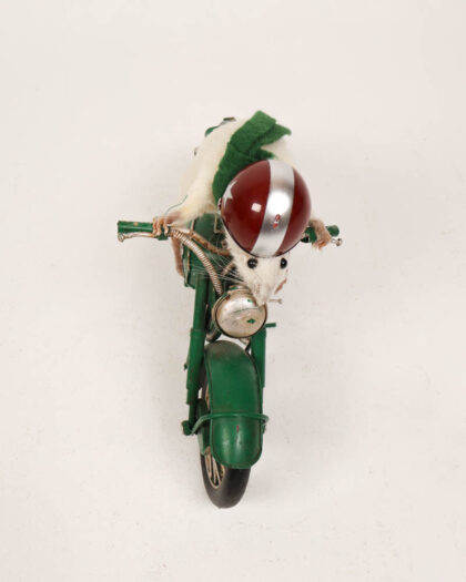 This taxidermy mouse is riding a green painted metal motorcycle. The mouse is positioned as if it is steering the bike, with its paws on the handlebars. It wears a red and silver helmet and a green fabric scarf. The motorcycle is painted in a dark green colour, showing some signs of wear adding to its vintage feel. It would be a great talking point for a man cave or eclectic display.