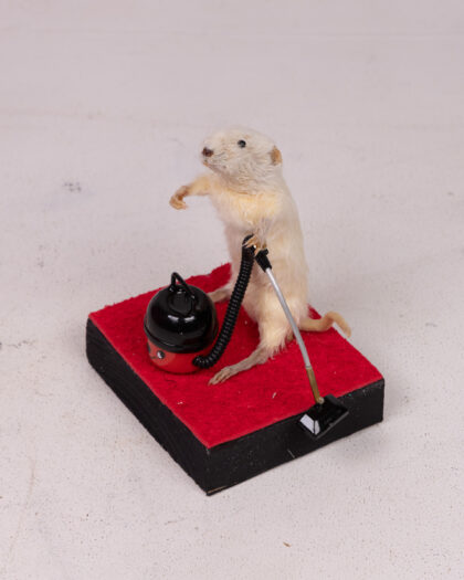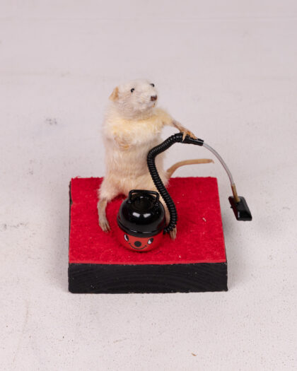 A quirky taxidermy mouse posed with a toy Henry Hoover on a wooden base with a red carpeted section. A fun piece for a unique home display.