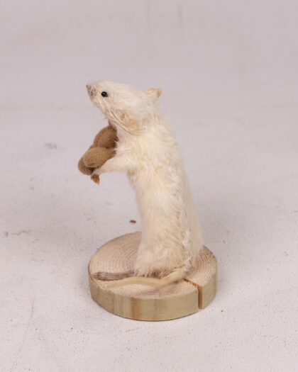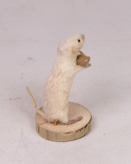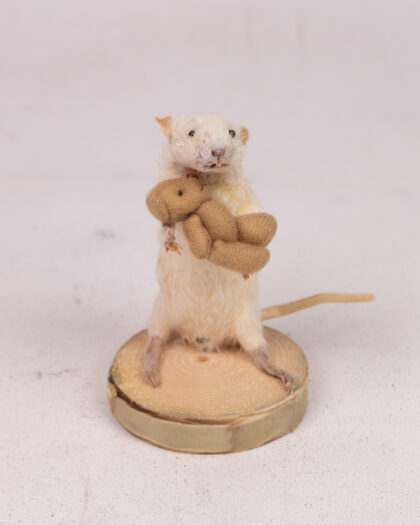 This is a handcrafted taxidermy display featuring a cream-coloured mouse standing upright on a wooden base. The mouse is holding a small brown teddy bear. The mouse is mounted on a rustic wood slice base, adding to its quirky charm.