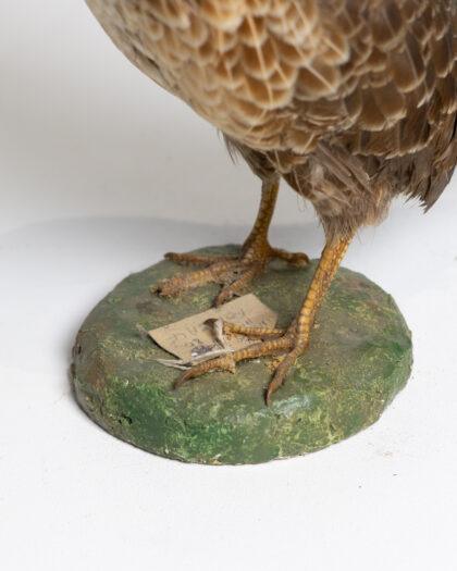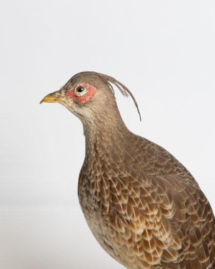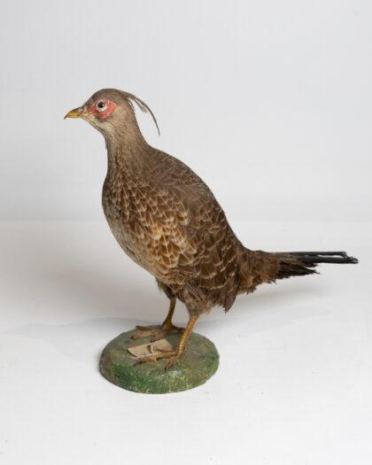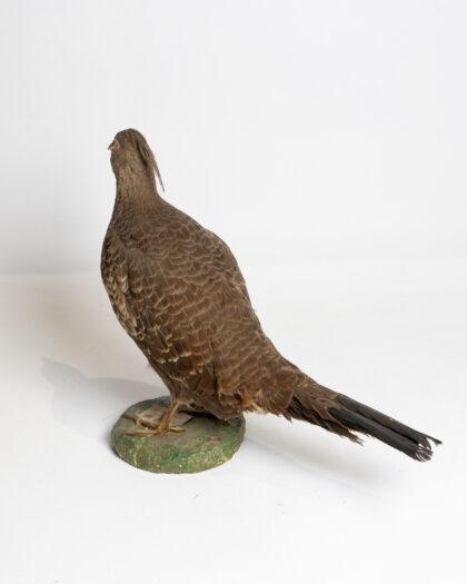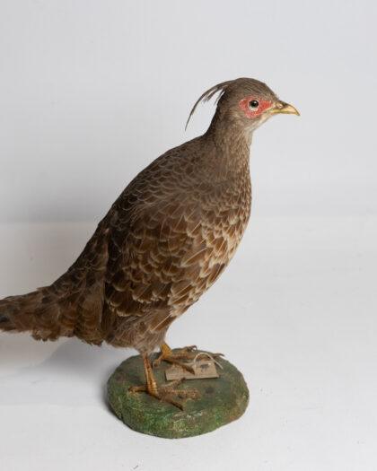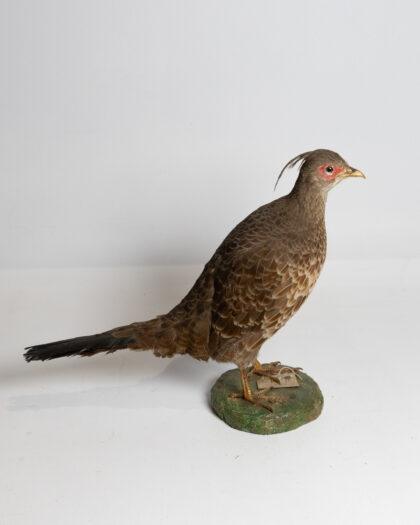 This taxidermy female Kalij pheasant is carefully preserved, showcasing intricate feather details and realistic features. It stands on a sturdy base, making it ideal for display in a living room or study. This piece is in excellent condition, providing a glimpse into the beauty of avian wildlife.
