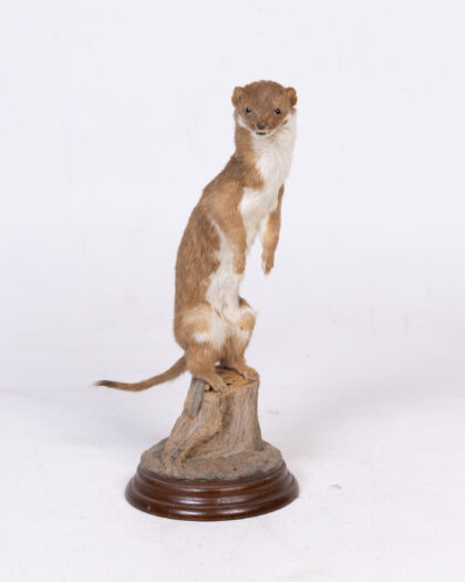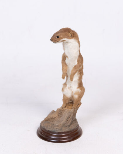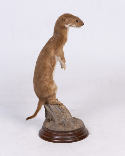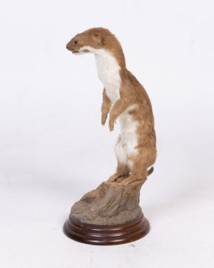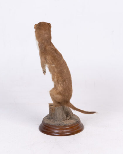This is a taxidermy least weasel (Mustela nivalis), mounted on a piece of wood and affixed to a decorative wooden base. The stoat is in a standing position and the taxidermy appears well-preserved. The weasel's fur is a mix of brown and white. The wooden base is dark brown with a lightly-worn finish. This curious piece is perfect for collectors or unique home decor.