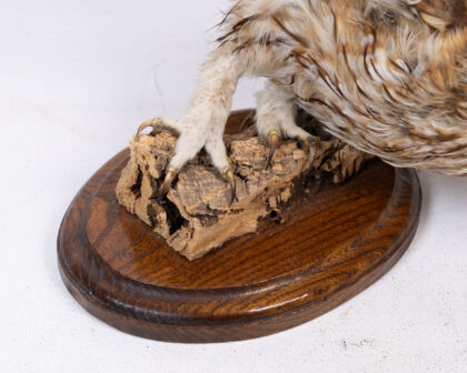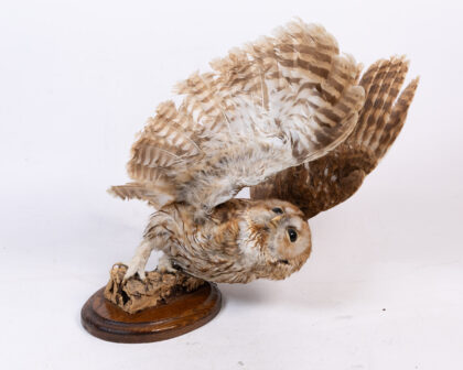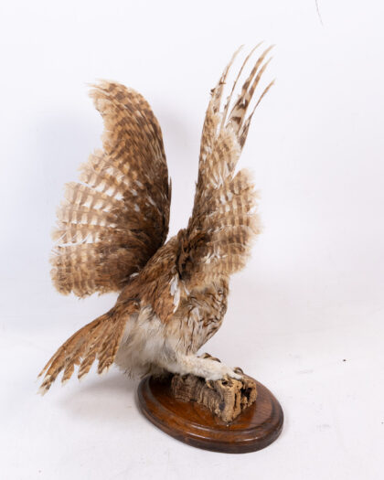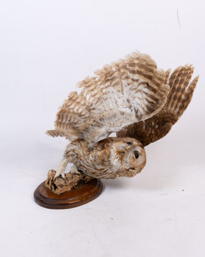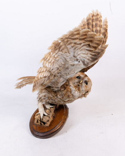 This is a taxidermied owl posed in mid-flight, mounted on a piece of natural wood attached to a varnished wooden base. The owl features mottled brown and cream feathers, dark eyes and sharp talons. A unique piece of natural history decor. The condition is very good.