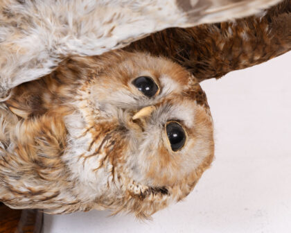 Taxidermied owl in mid-flight pose, mounted on a natural wood base. A unique and interesting decor piece for nature lovers.