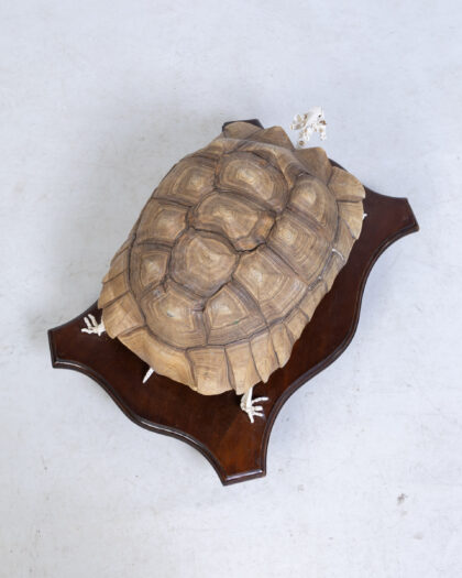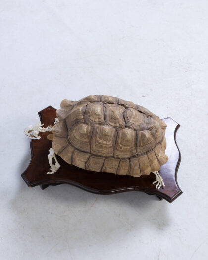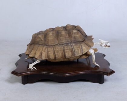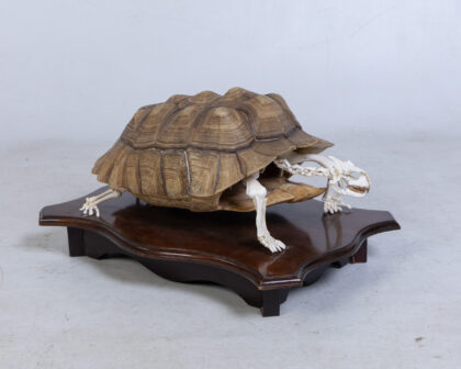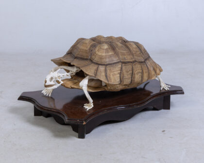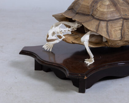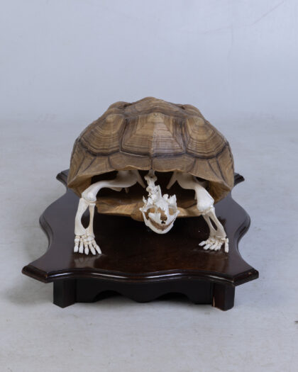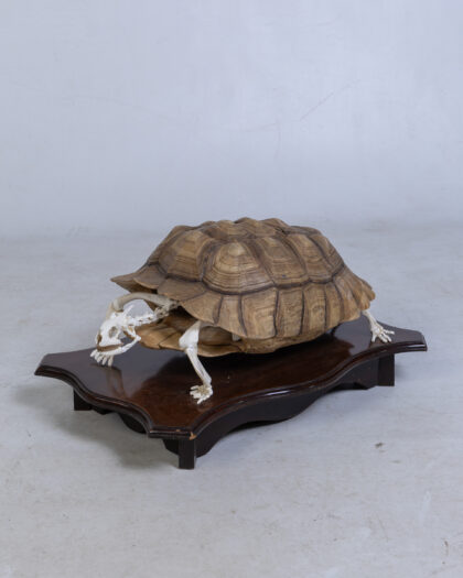 Unique taxidermy display featuring a tortoise shell with its skeleton, mounted on an ornate wooden stand. The shell displays natural patterns and textures. The skeleton is visible beneath, offering an anatomical view. The dark wood stand is intricately carved with a decorative edge, adding to the piece's overall aesthetic. Ideal for collectors of natural history items, this piece is certain to be a conversation starter. This piece would look great in a study, library or natural history museum.