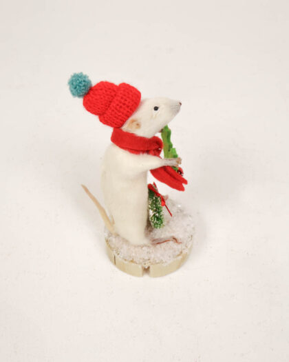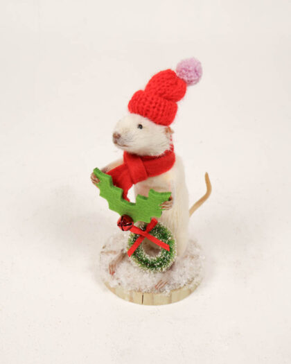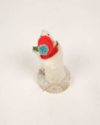 Taxidermied white mouse wearing a red knitted hat and scarf, holding a festive sprig of holly. Displayed on a faux-snow base. Ideal for Christmas decor.