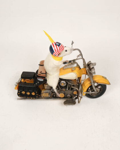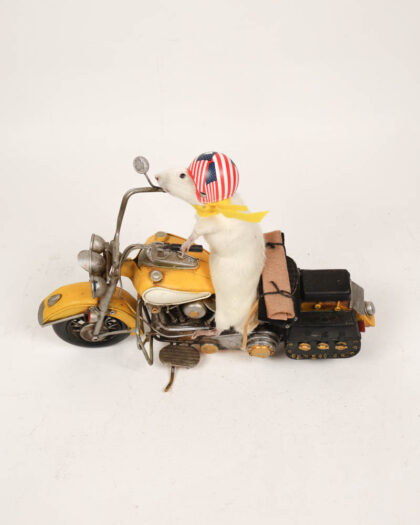 Taxidermy white mouse dressed in a yellow suit, riding a yellow and white motorcycle. The motorcycle has an American flag helmet. The mouse also has a yellow scarf on. The luggage on the back of the motorbike is black. The metal motorbike features lots of detail. There is age-related wear to the item.