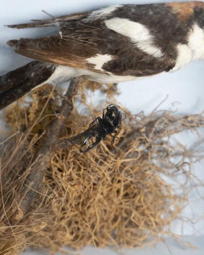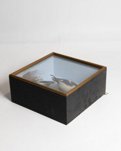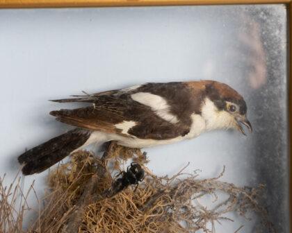 This exquisite piece features a meticulously preserved male woodchat shrike, showcased in a gold-framed glass display. The bird is artfully positioned among naturalistic elements, providing a lifelike scene that captures the beauty of avian wildlife. Perfect for display in a study, living room, or collection. The condition is excellent, with no visible damage to the frame or the bird.