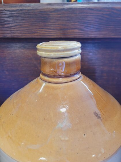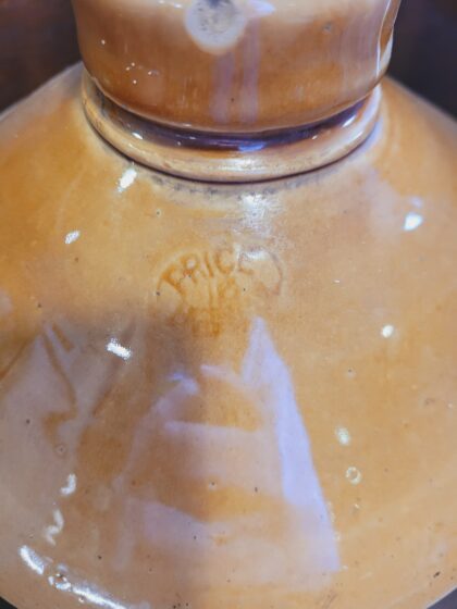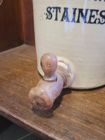 A brown two tone glazed stoneware flagon. Bears black lettering which reads, “Taylor & Co's Estd. 1849 Mineral Waters Staines”. Comes with lid and tap. Bears impressed "Price" maker's mark.