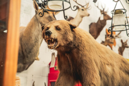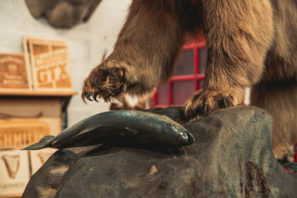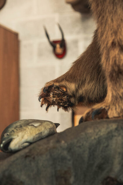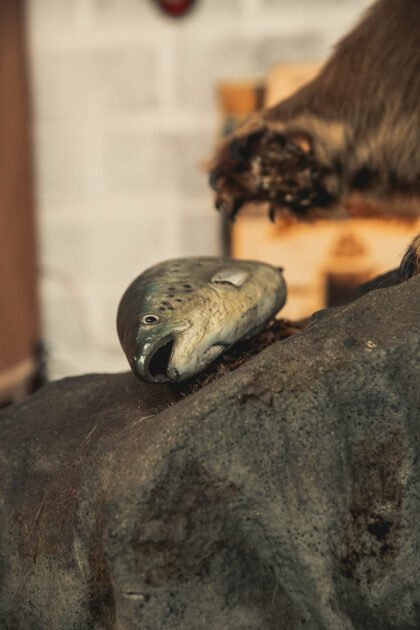 A huge grizzly bear set atop a rock after catching a fish.
