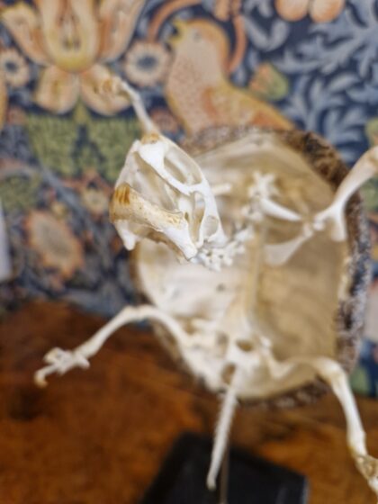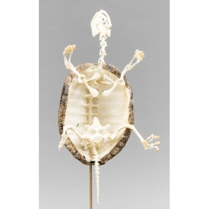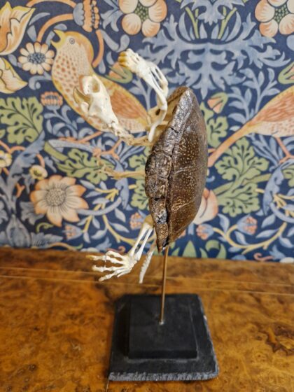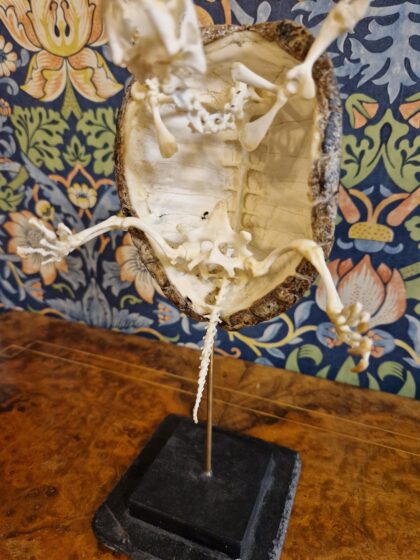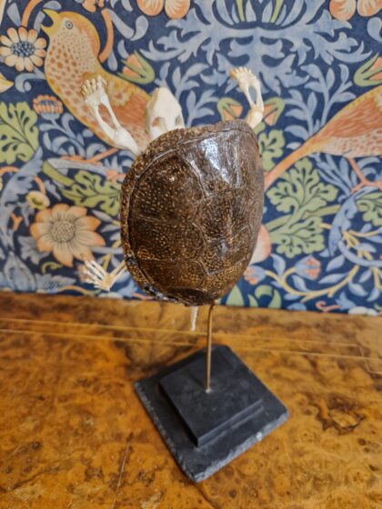 A European pond turtle (Emys Orbicularis) skeleton mounted to a slate and ebonised wood base.