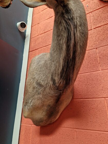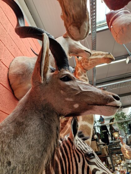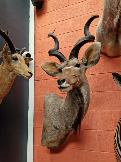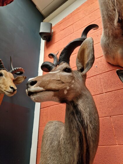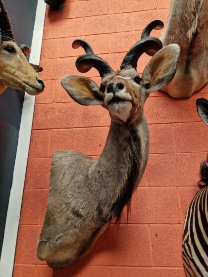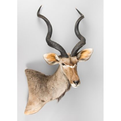 A taxidermy greater kudu (tragelaphus strepsiceros) pedestal mount with detachable horns from South Africa.