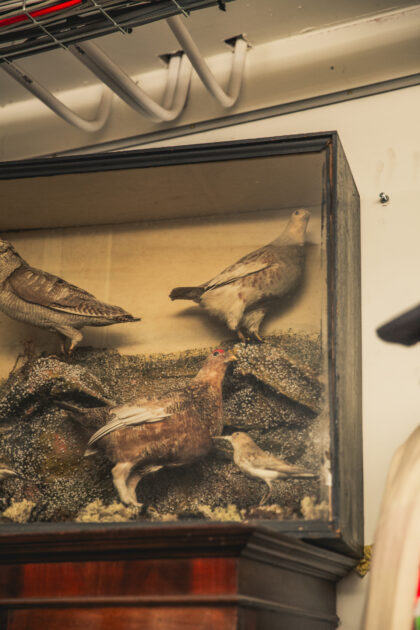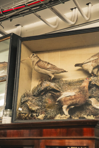 A glass fronted display case showing five different birds.