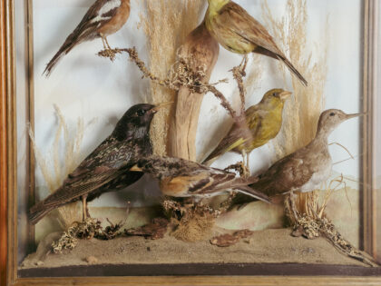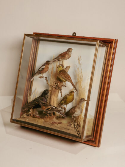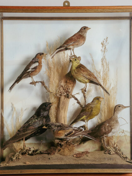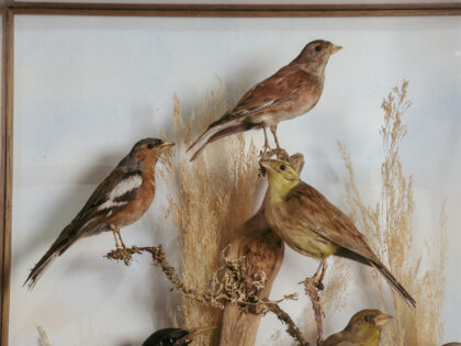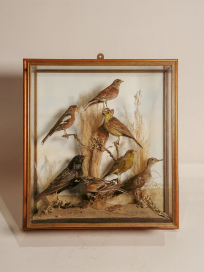A glass display case featuring seven taxidermy birds.