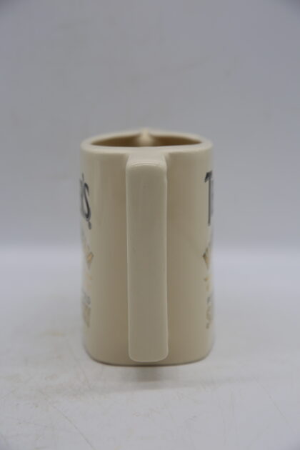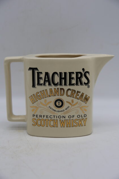 A white glazed ceramic bartop water jug. Bears black and gilt lettering which reads, "Teacher's Highland Cream Established 1830 Perfection of Old Scotch Whisky". Made by Seton Pottery and bears black backstamp to base.