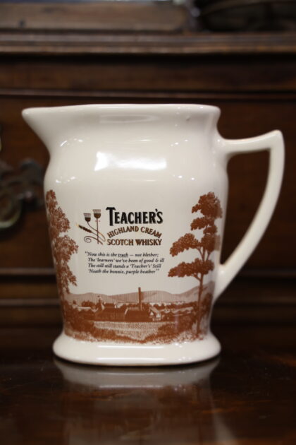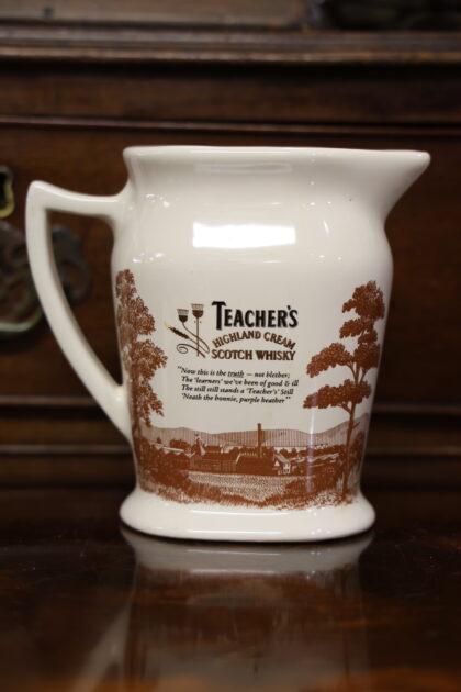 A white ceramic jug for Teacher's Highland Cream Scotch Whisky. Made by Seton Pottery and bears gilt backstamp to base.