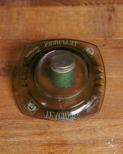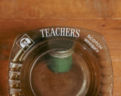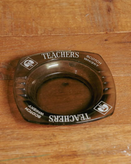 A grey glass ashtray for Teacher's Scotch Whisky.