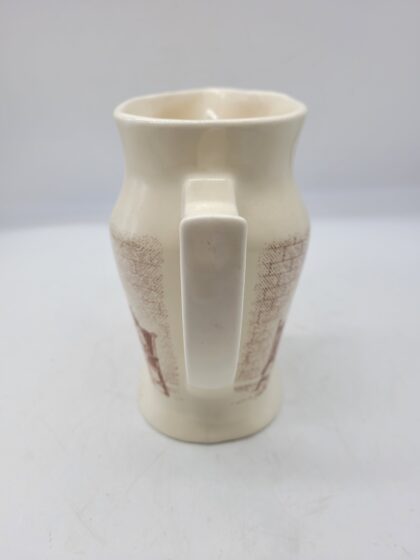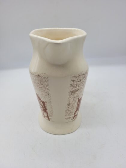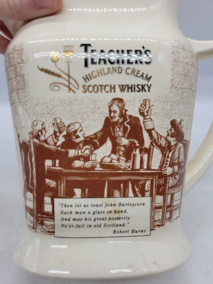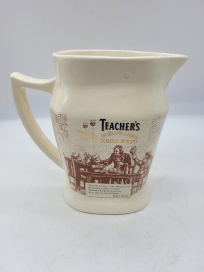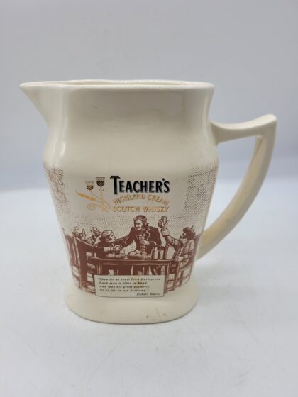 A cream glazed ceramic bartop water jug. Bears black and gilt lettering that reads, "Teacher's Highland Cream Scotch Whisky" and a quote from Robert Burns. Made by Wade and bears red backstamp to base.