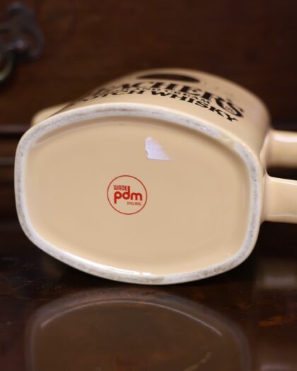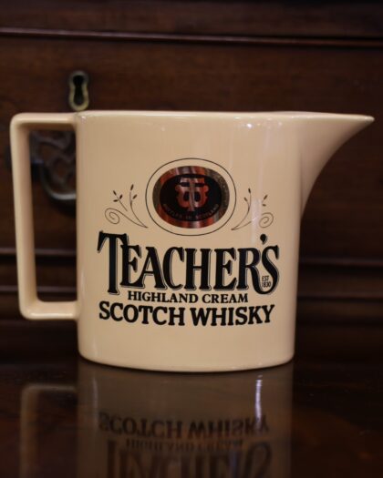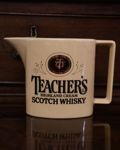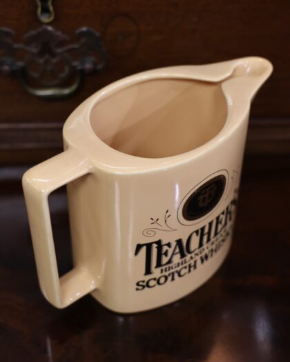 A cream-coloured glazed ceramic bartop water jug. Bears gilt and black lettering which reads, "Teacher's Highland Cream Scotch Whisky Est 1830 Bottled in Scotland". Made by Wade and bears red backstamp to base.