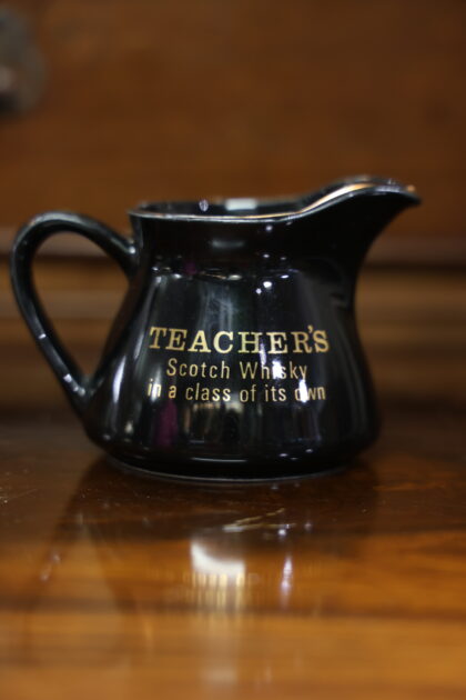 A black ceramic jug for Teacher's Scotch Whisky.