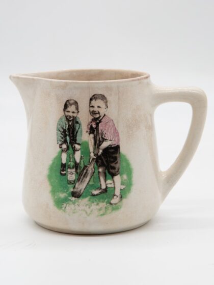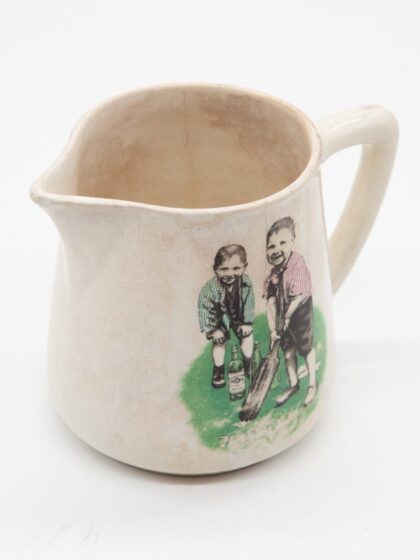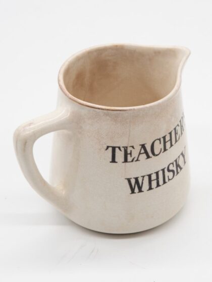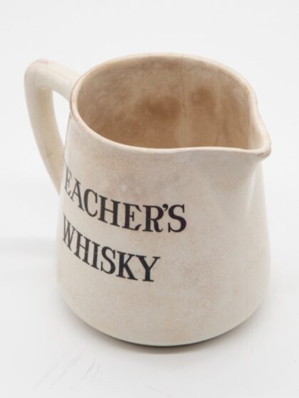 A glazed, ceramic bartop water jug for Teacher's Whisky. Bears black lettering to base which reads, "Made for Wm. Teacher & Sons Ltd. Glasgow & London". This jug is damaged and has several cracks.