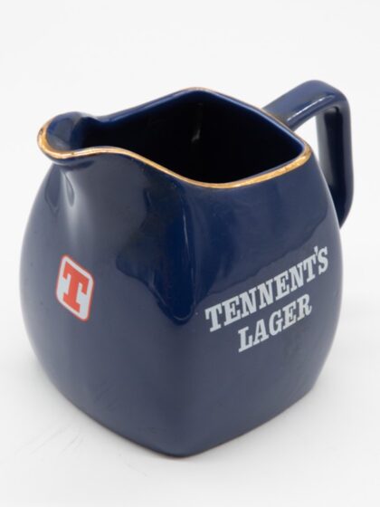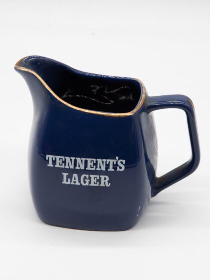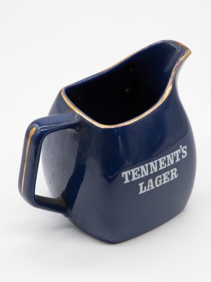 A blue glazed ceramic bartop water jug. Bears white lettering which reads, “Tennent’s Lager” and gilt decoration. Made by Wade and bears green backstamp to base.