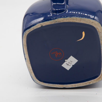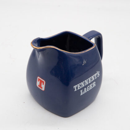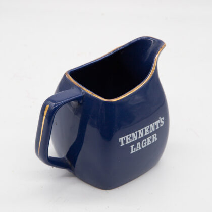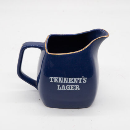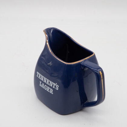 A blue glazed ceramic bartop water jug. Bears white lettering which reads, “Tennent’s Lager” and gilt decoration. Made by Wade and bears red backstamp to base.