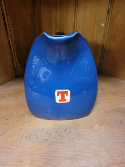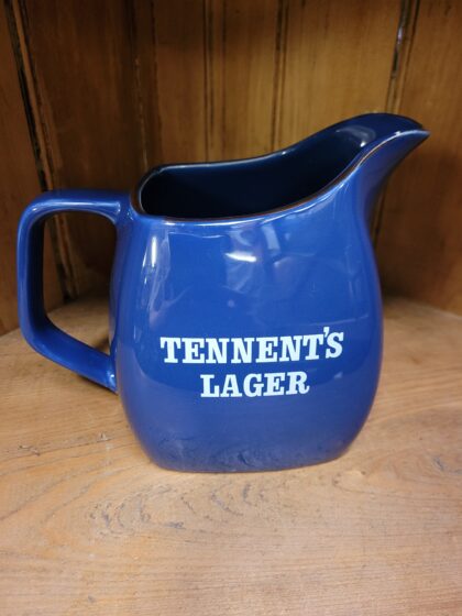 A blue glazed ceramic bartop water jug. Bears white lettering which reads, “Tennent’s Lager” and gilt decoration. Made by Wade and bears red backstamp to base.