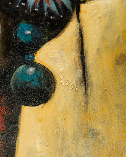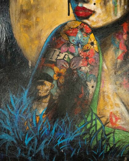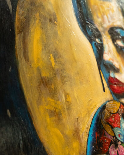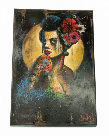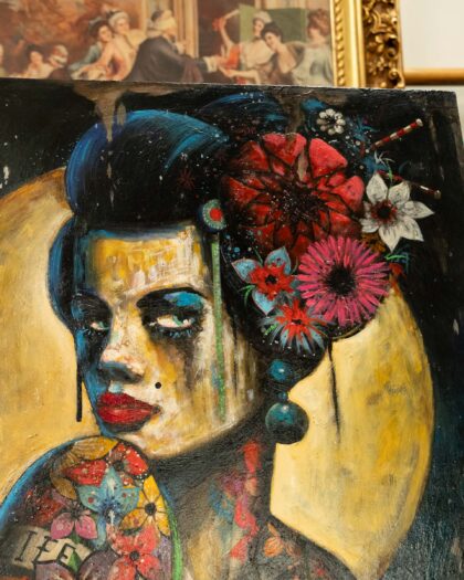 Original Terry Bradley oil painting titled 'Confidence', created in 2019. This striking piece features Bradley's signature style, depicting a Geisha style female bust with floral hair adornments, against a muted gold backdrop. The painting features vibrant use of blues, reds and greens creating a colourful contrast with the heavy black shadowing. Signed by the artist. Dimensions: 40 x 28 inches (101.6 x 71.1 cm). Medium: Oil on Board. This is not a print.