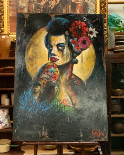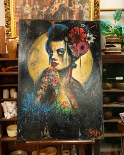 Original Terry Bradley 'Confidence' oil painting, 2019. Geisha style, signed, 40 x 28 inches. Unique and striking art for the modern home.